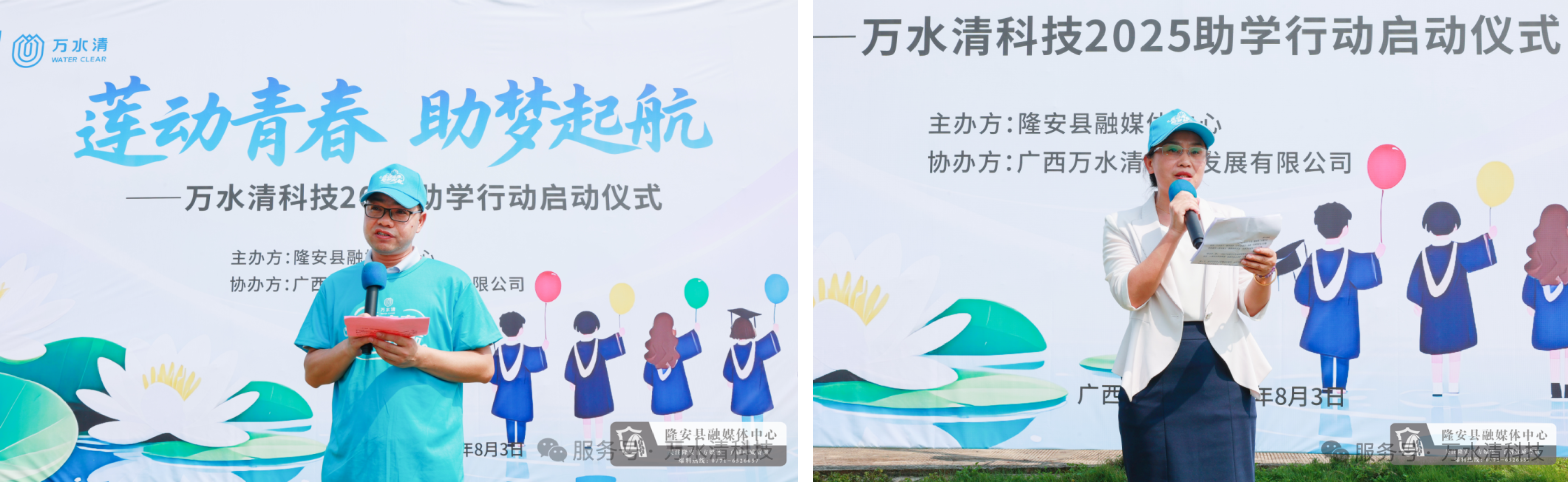 启动仪式上,万水清科技作为本次活动的发起者和赞助商,向学子们介绍了活动的背景,并给予了深切的祝福,展现了企业强烈的社会责任和担当。万水清科技战略合作伙伴景然环保科技的董事长梁淑英出席仪式,并在讲话中揭示了睡莲产业的生态深意。她表示,睡莲产业承载着净化水体的环保使命,今日播撒的既是希望种子,也是绿色未来。隆安县融媒体中心、那桐镇的有关负责人也在启动仪式上致辞,感谢企业的爱心支持,祝福学子们前程似锦,鼓励他们学有所成回报家乡。